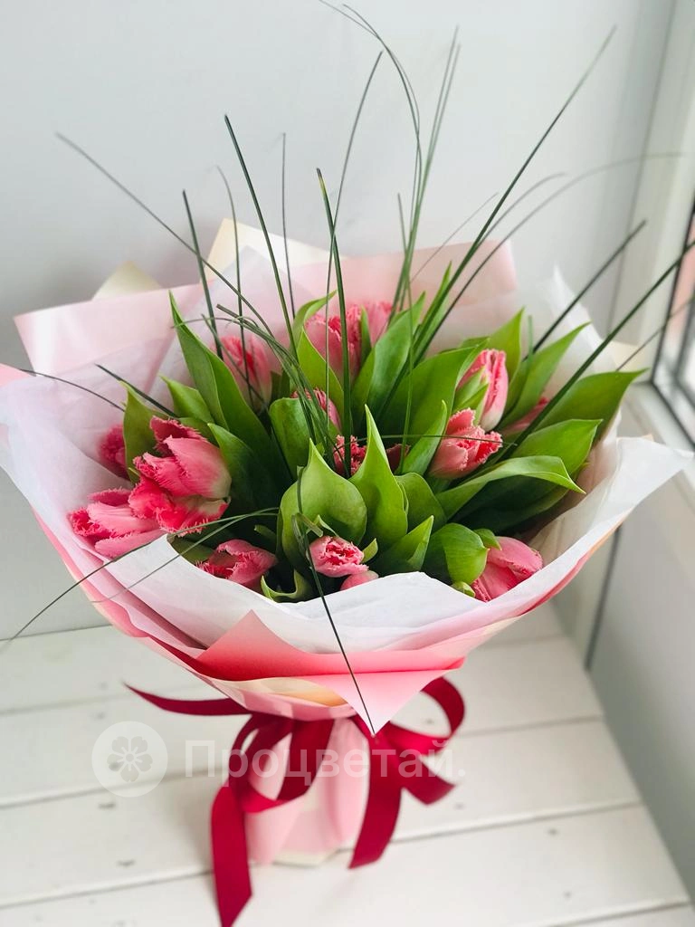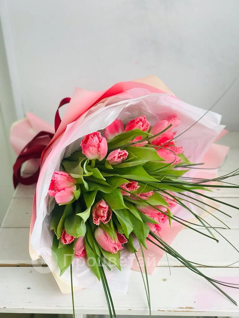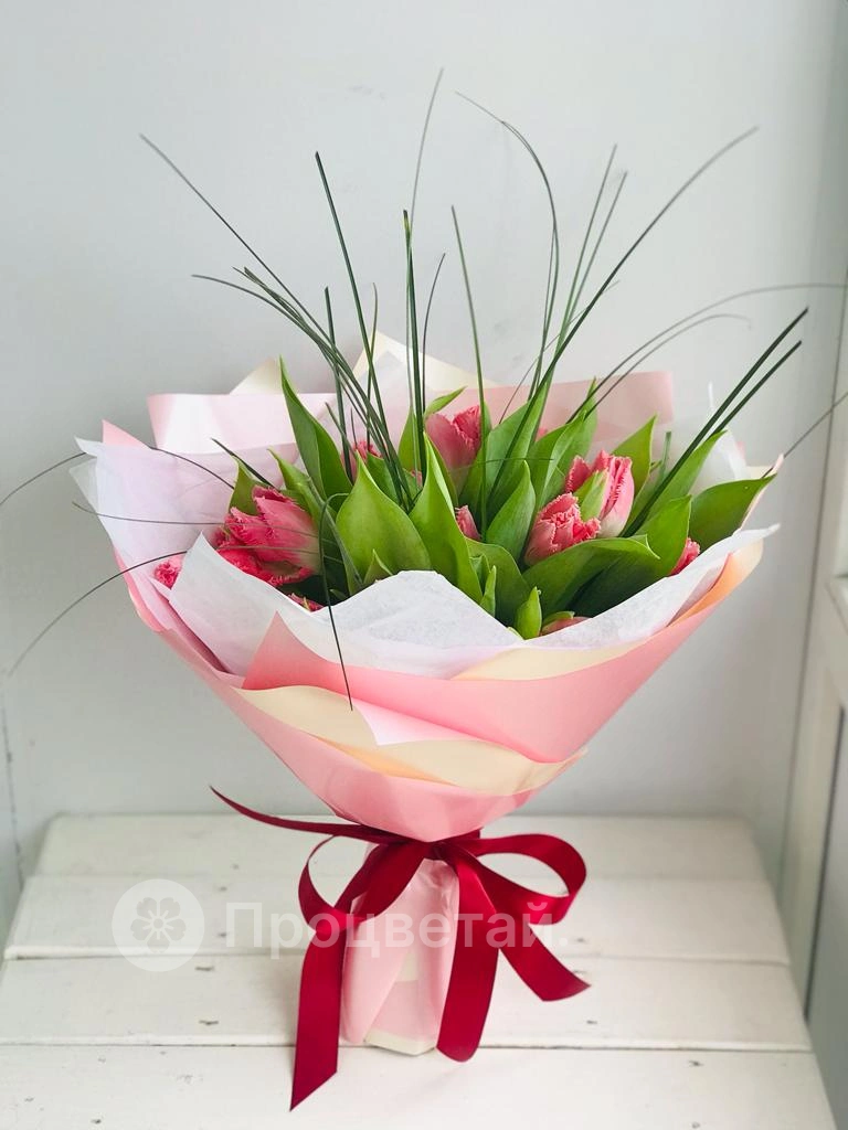 Букет из тюльпанов с зеленью. Абсолютно весенний букет. Обязательно подарит хорошее, солнечное настроение получательнице.