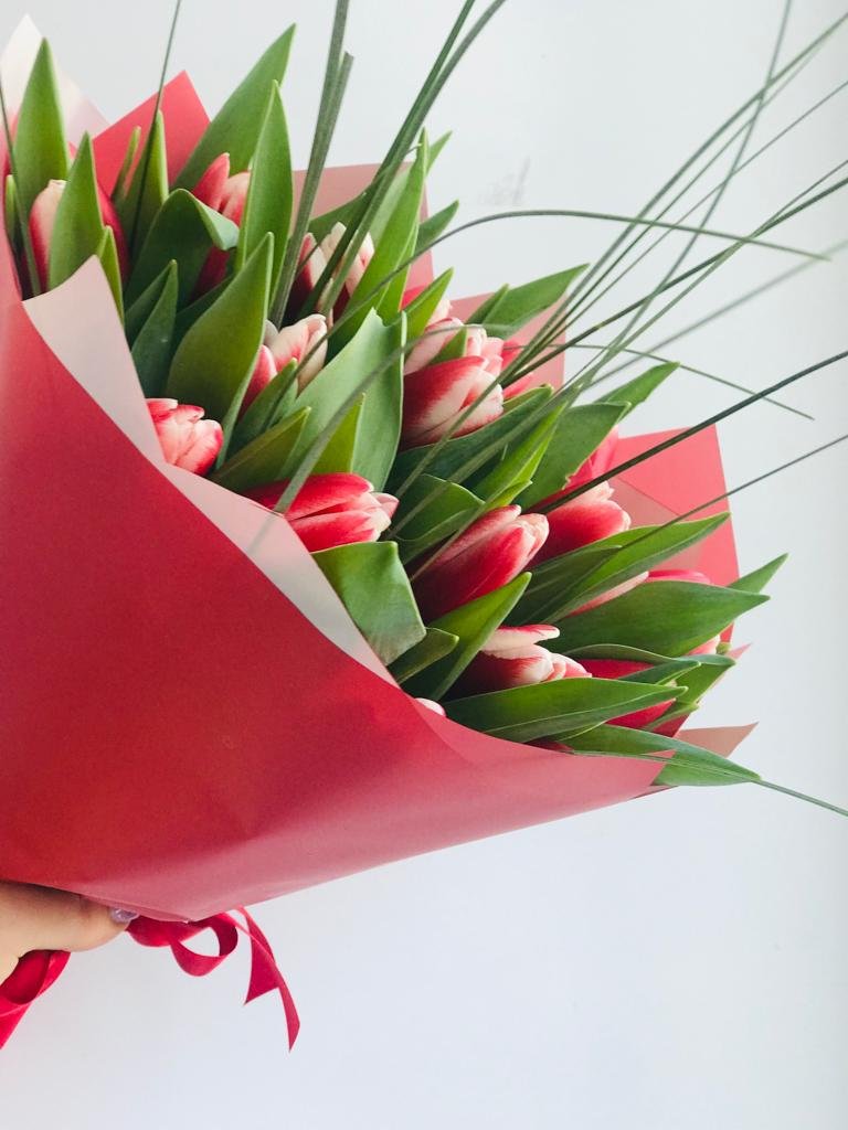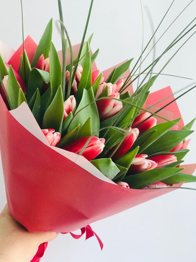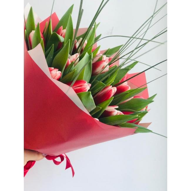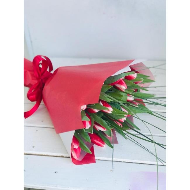 Описание Нежный букетик из тюльпанов с зеленью. Прекрасно подойдет для молодой девушки. Прекрасный , нежный, волшебный букетик, понравится вам и вашим любимым.