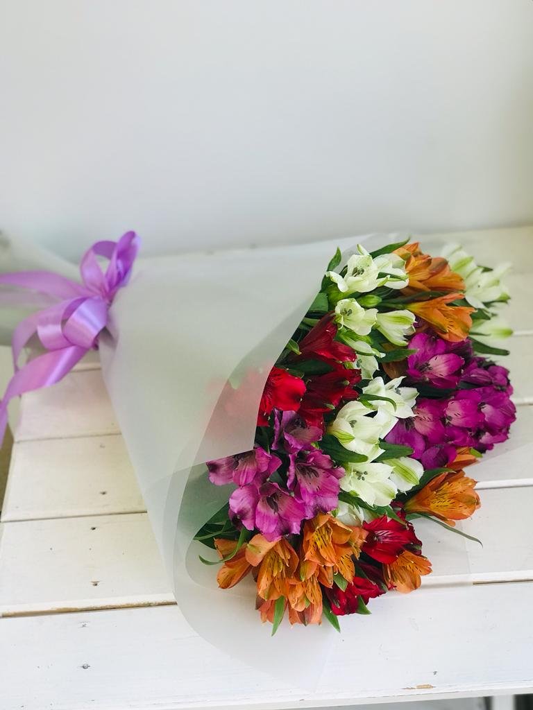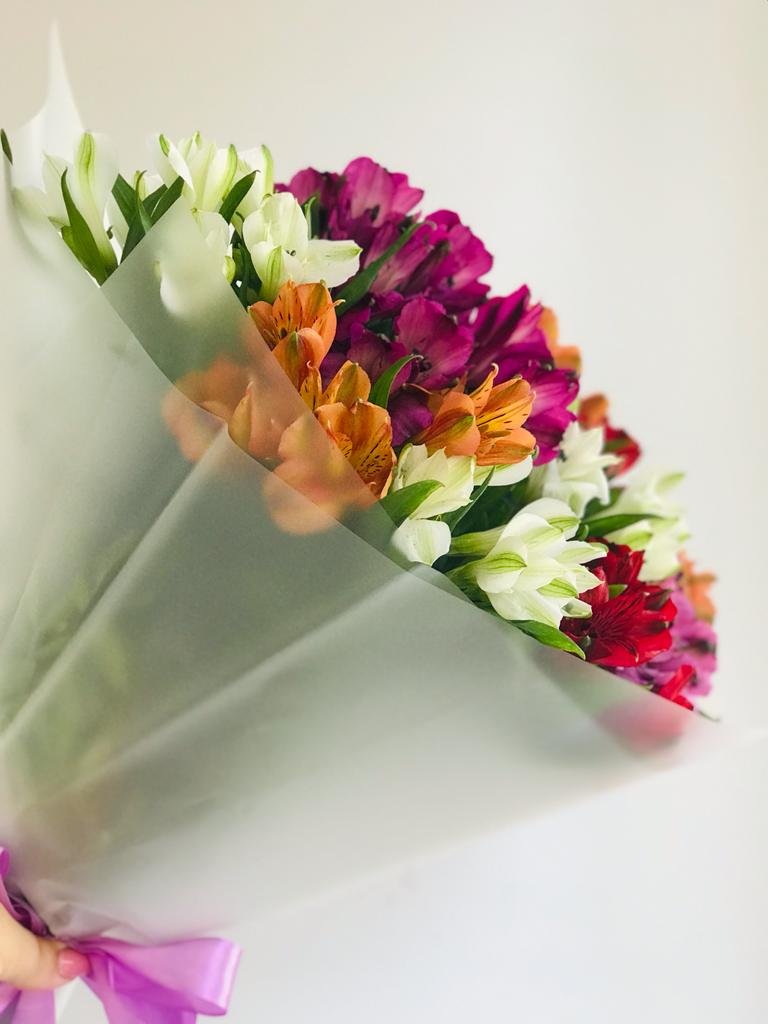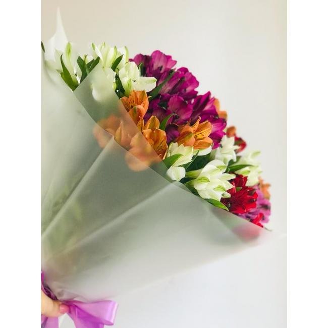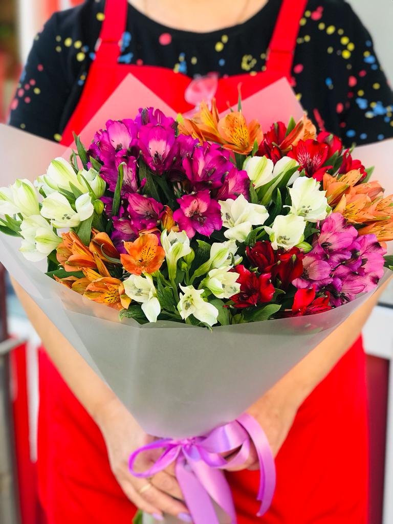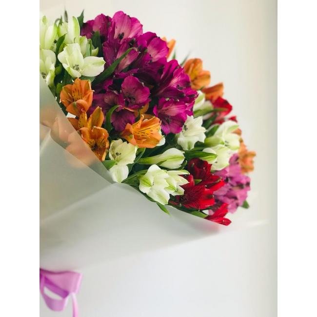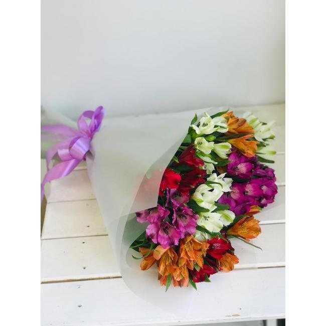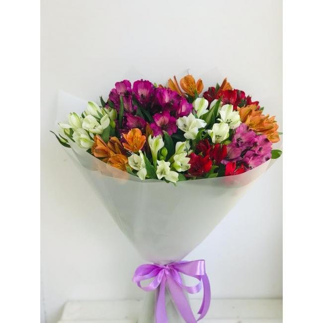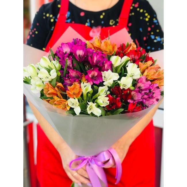 Описание Прекрасный букетик с яркой альстромерией. Цветок альстромерия рекордсмен по долговечности нахождения в срезанном виде в вазе. Может стоять до 1 ,месяца. Его колокольчики растут и раскрываются, превращаясь в пушистое соцветие. Порадует в любое время года!