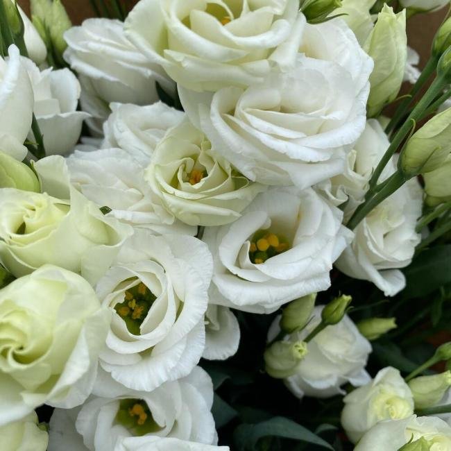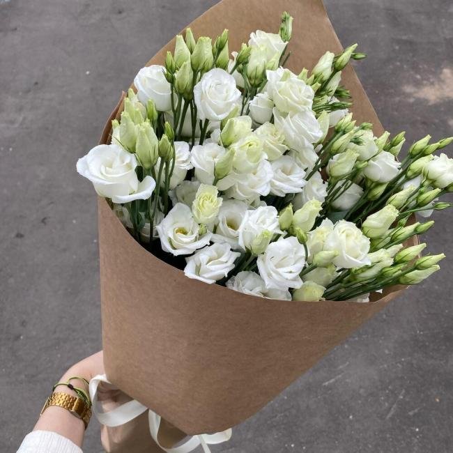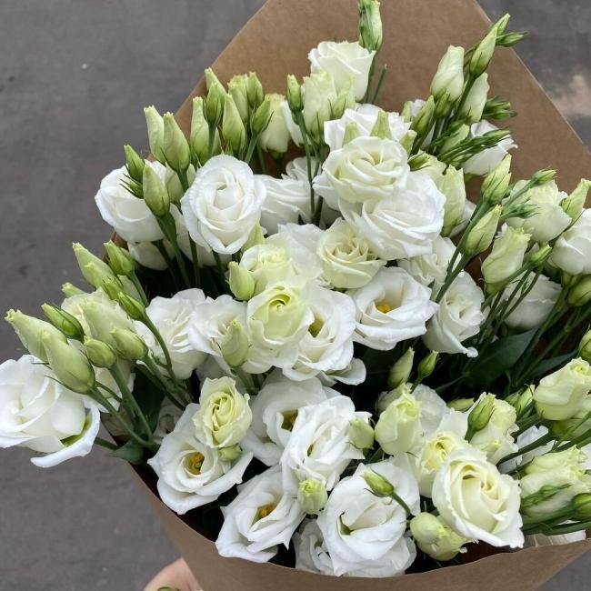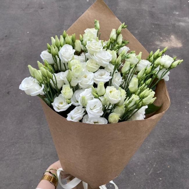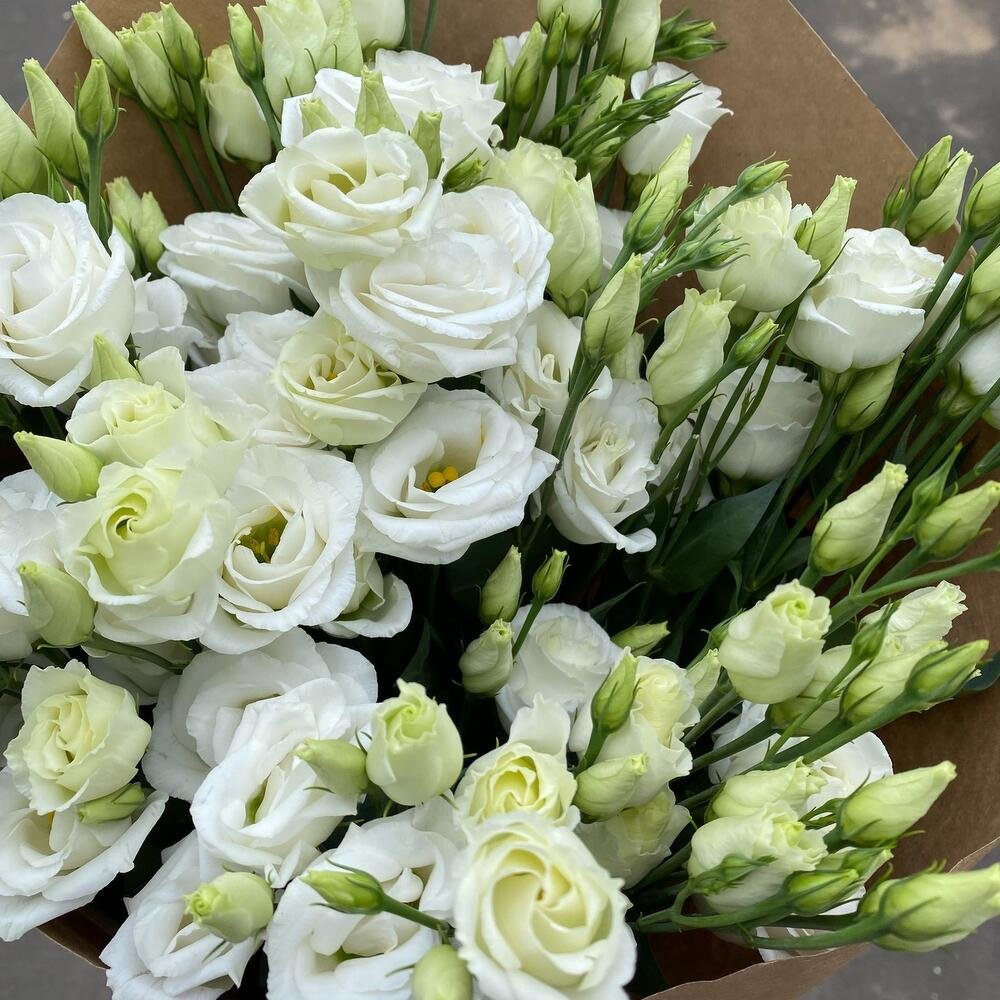 Описание Букет из белоснежной эустомы. Лаконичный и приятный букет. Ничего лишнего, разверни и ставь в вазу.