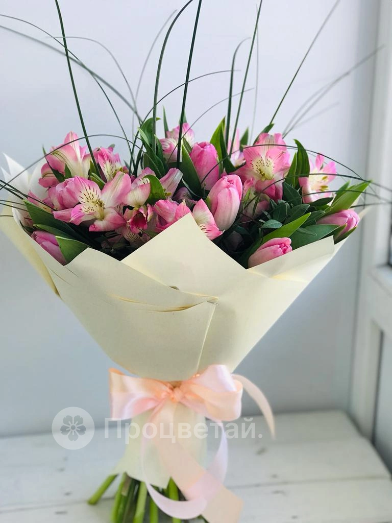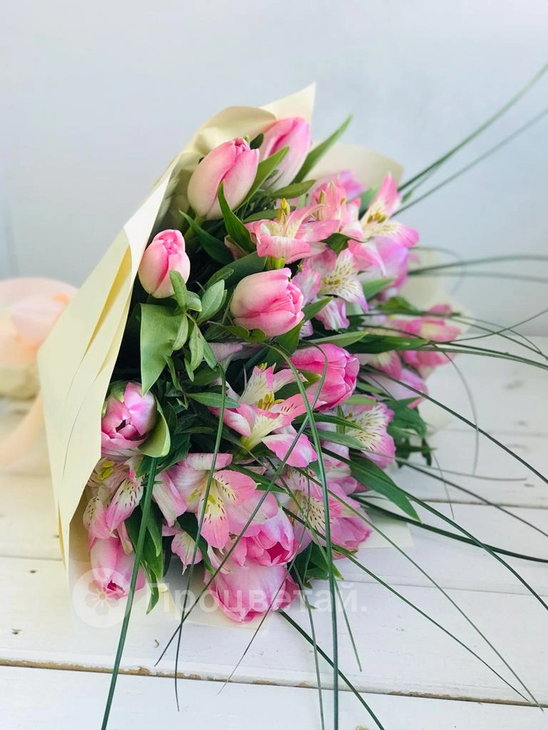 Нежный весенний букет с тюльпанами и альстромерией. Восхитительное очарование трепетных тюльпанов, создает уют и тепло в сердце. Дарите этот букет любимым и близким людям. Радуйте их весенними цветами.