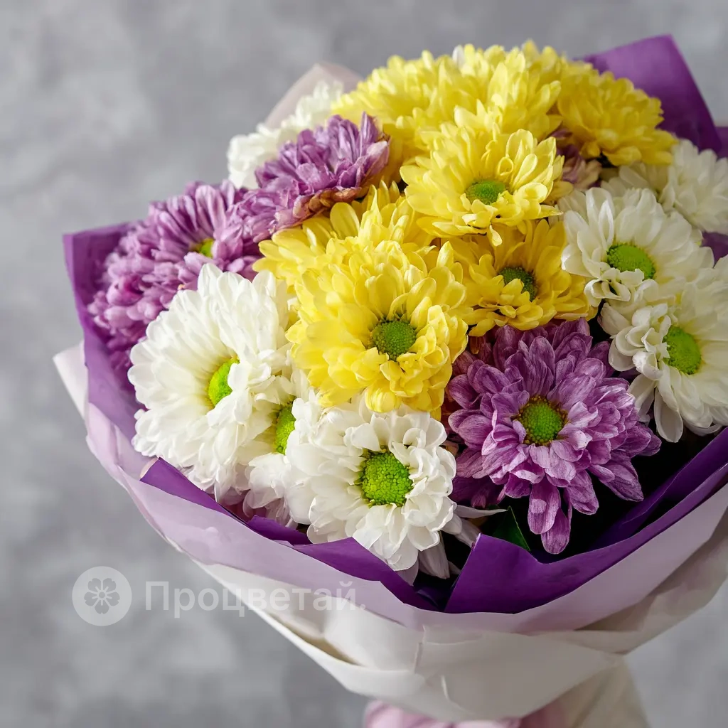 Нежный букет в пастельных сиреневых тонах с акцентами солнечного жёлтого и чистого белого. Создаёт ощущение лёгкости и утренней свежести. Отлично для подарка с романтическим подтекстом или в знак благодарности.