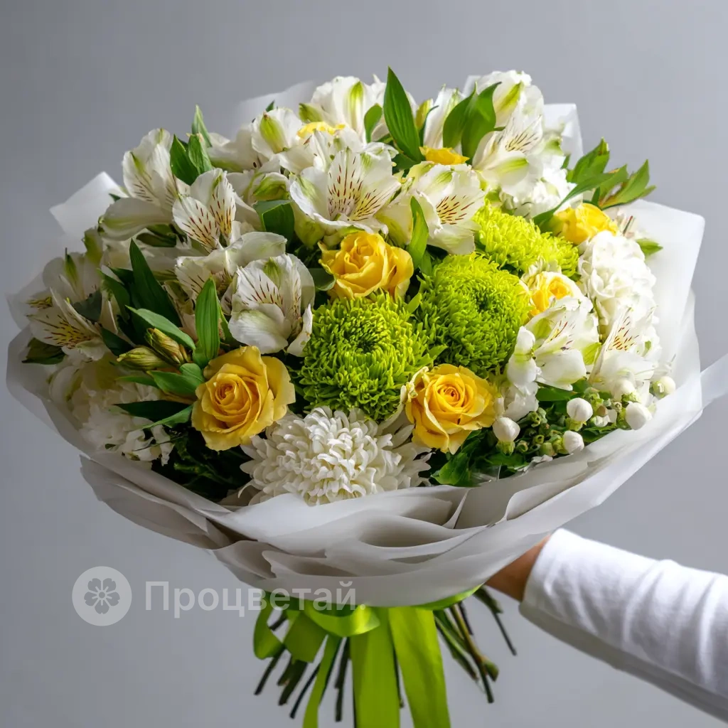 Композиция, как летняя песня — наполнена мягкими красками, теплом и светом. Альстромерии добавляют воздушности и утончённости. Универсальное решение для поздравления женщины или девушки.