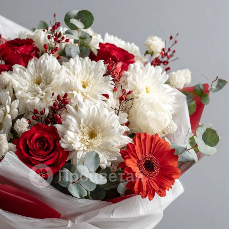 Собранный для торжеств и событий, этот букет наполнен яркими красками и хорошим настроением. Хризантемы долго сохраняют свежесть и эффектный вид, что делает их прекрасным выбором для праздника.