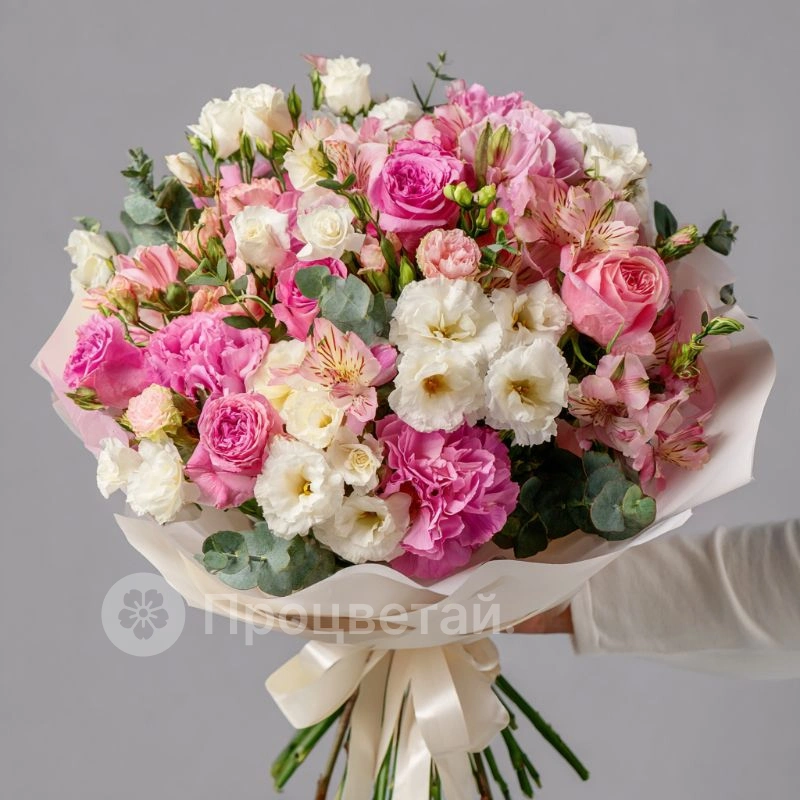 Светлая композиция, в которой раскрываются утренние оттенки розового и белого. Отличный подарок для женщин, ценящих утонченность.