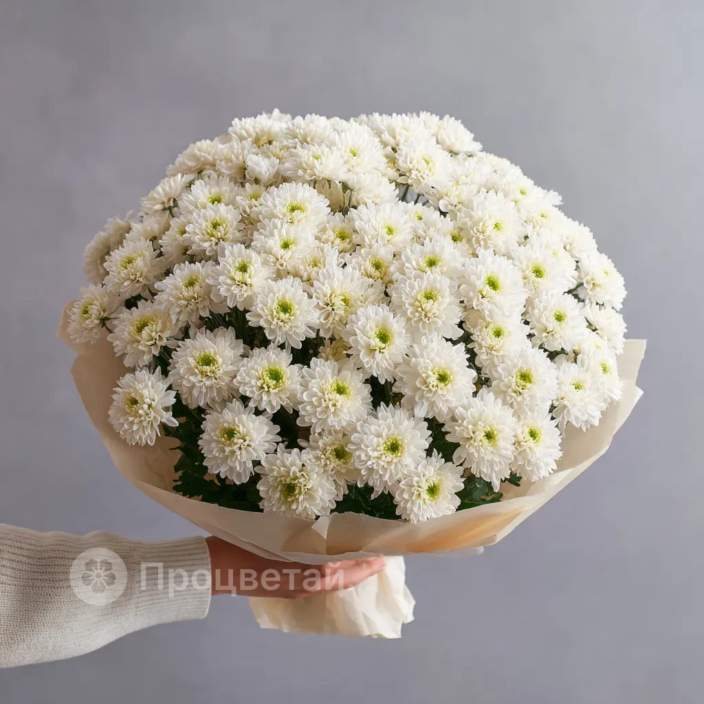 Классический букет из белых кустовых хризантем. Подойдёт для офиса, поздравлений, свиданий и просто — чтобы сделать день ярче.