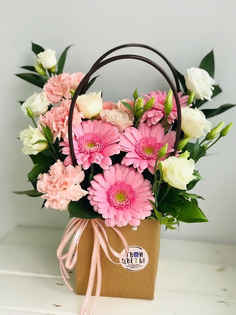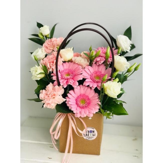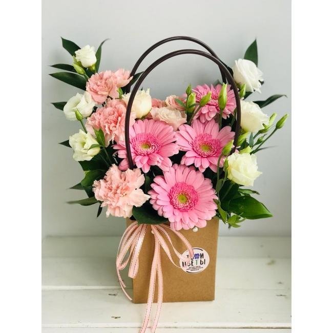 Описание Очень симпатичная сумочка с мини-герберой и эустомой. Нежные цвета композиции покоряют сердца. Порадует получательницу на День рождения, День матери, 8 марта, День влюбленных.