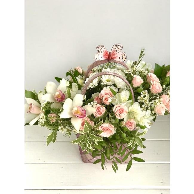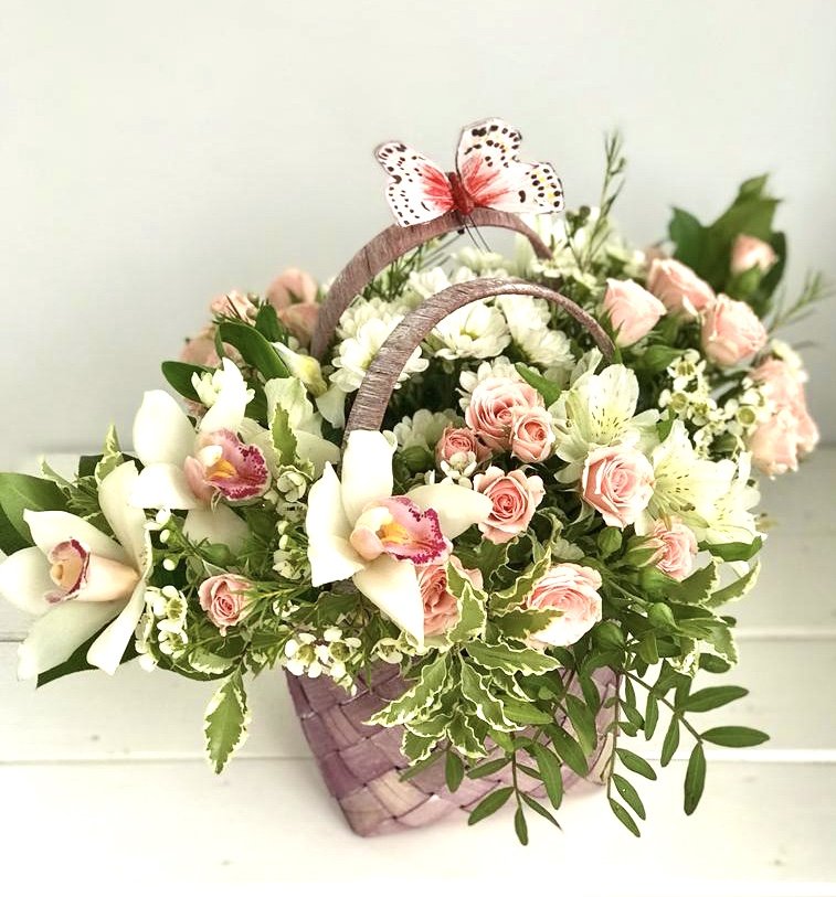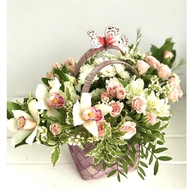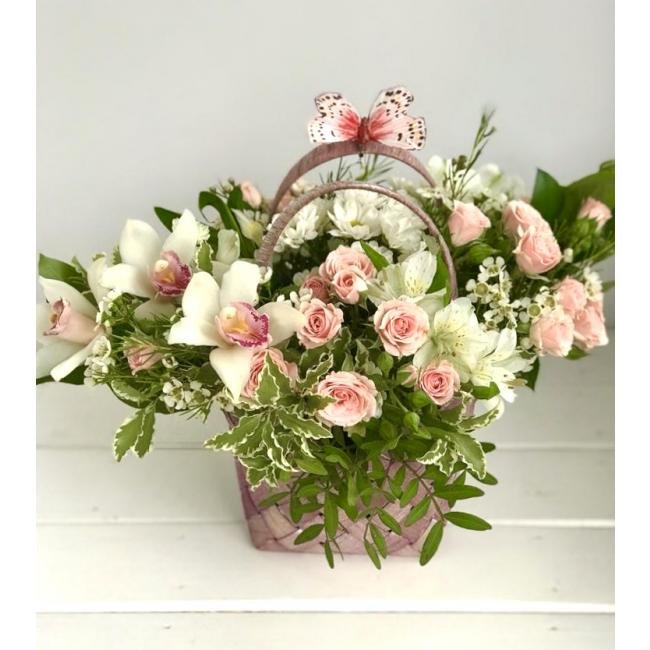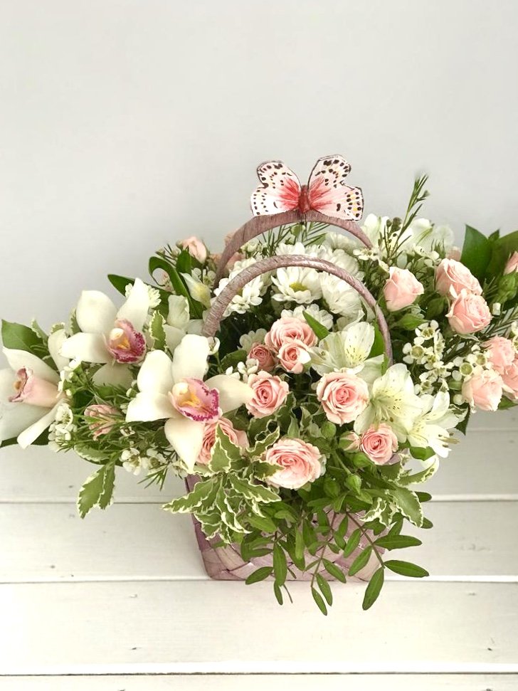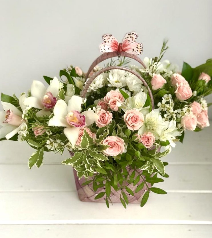 Описание Подарите праздник вместе с этой цветочной композицией в корзиночке. Воздушные белые и розовые тона задают легкое, светлое и радостное настроение и такой подарок запомниться надолго.