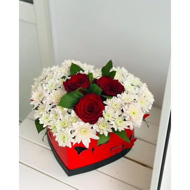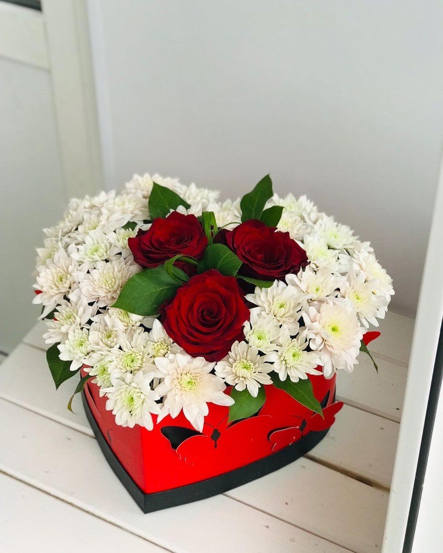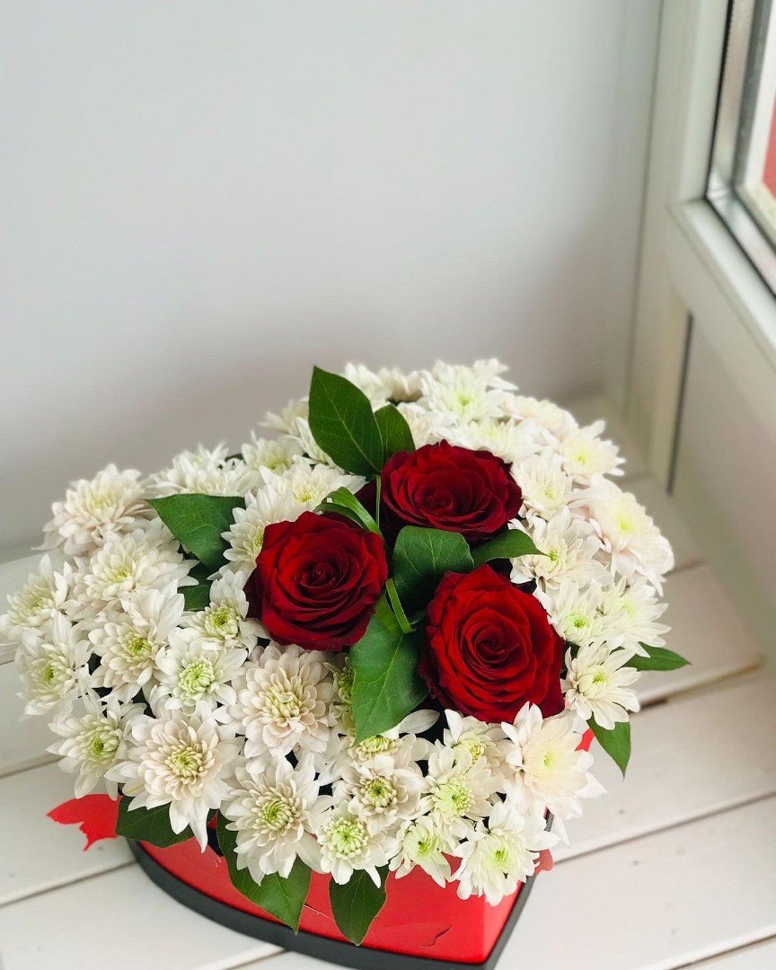 Описание Букет символизирует нежность ваших чувств и способен растопить лед в сердце даже самой неприступной красавицы. Бордовые бутоны роз, утопают в воздушной роскоши белых хризантем. *