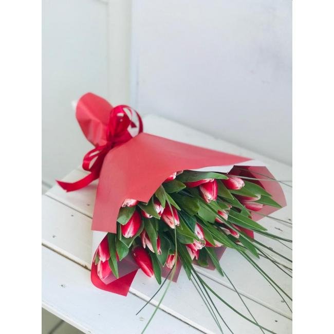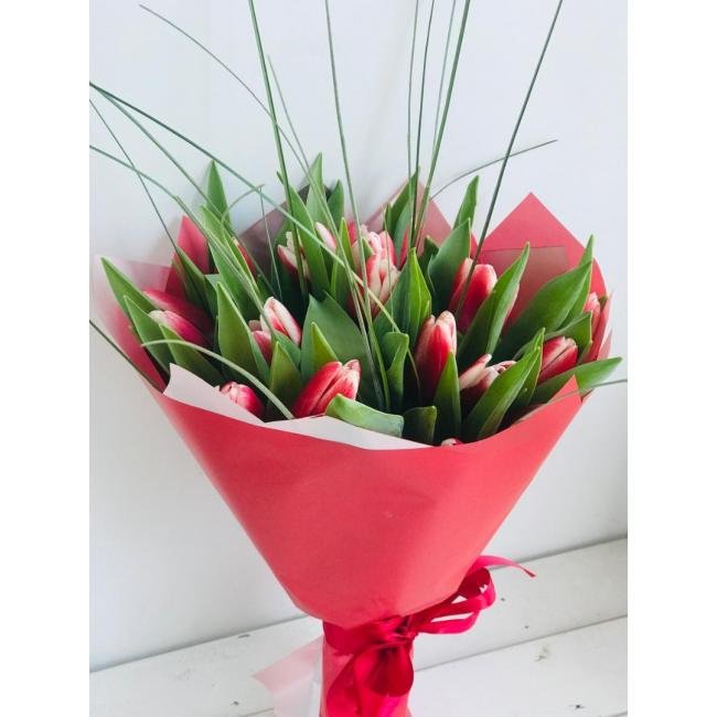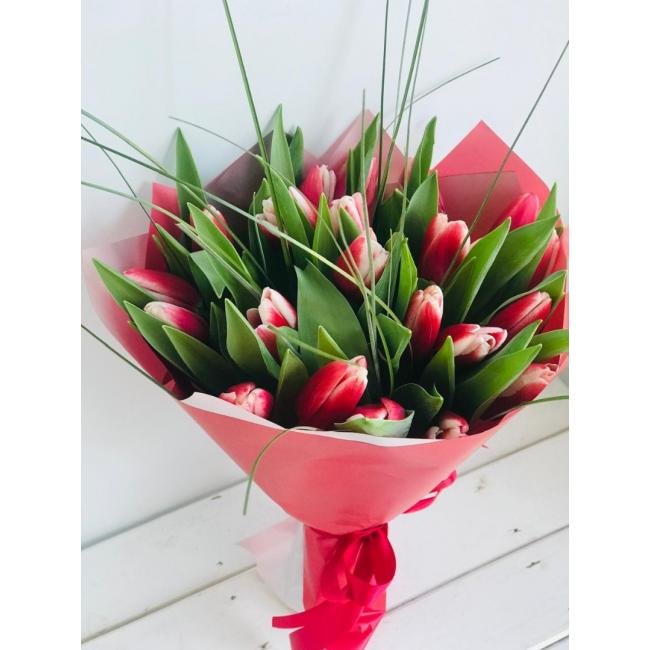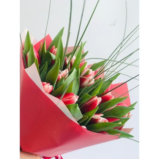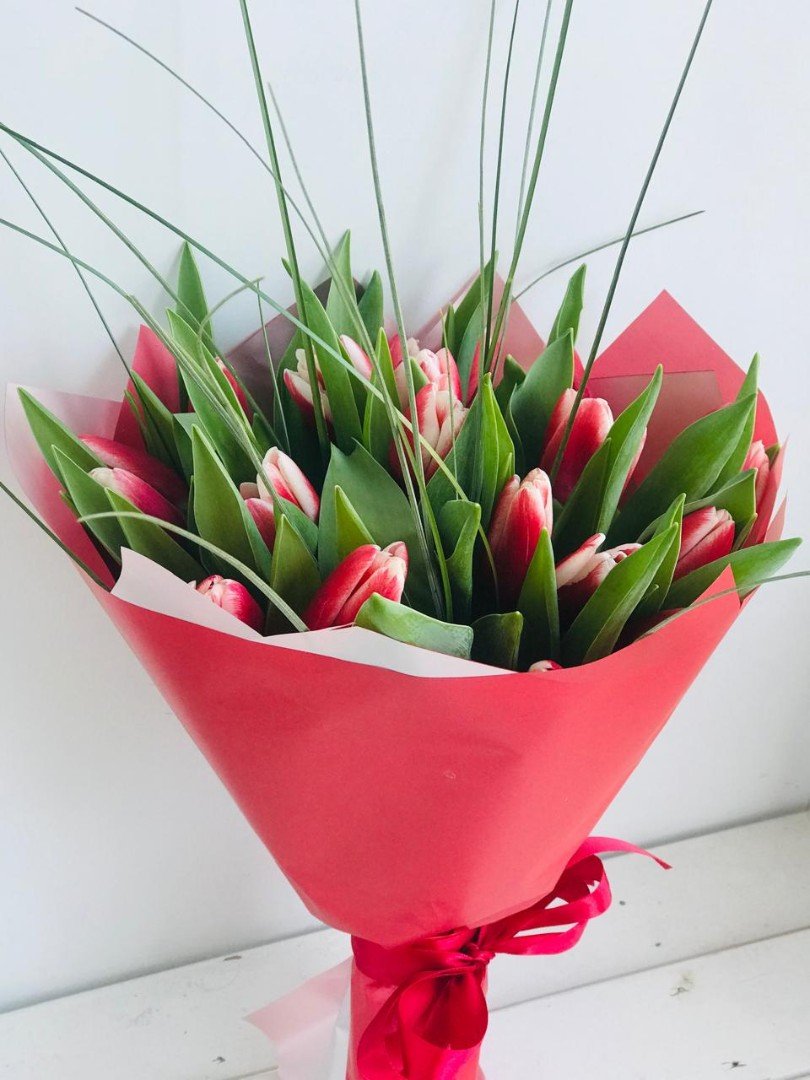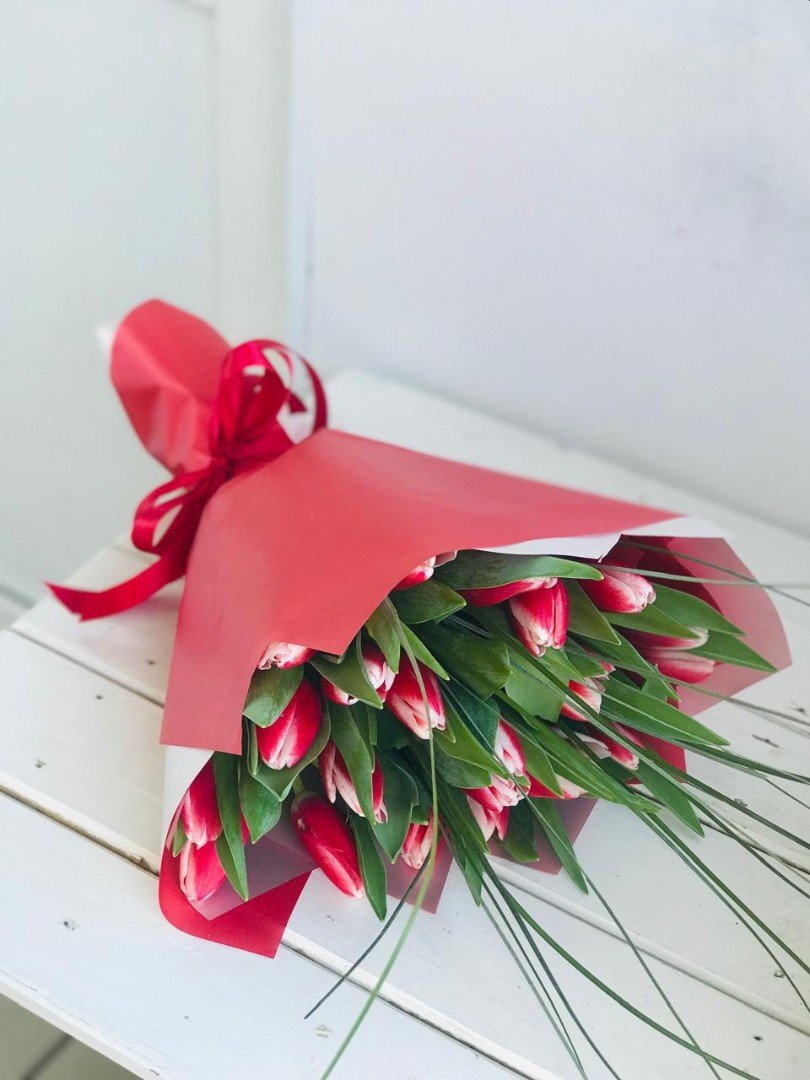 Описание Букет из весенних тюльпанов с зеленью. Классический букет на 8 марта и не только.