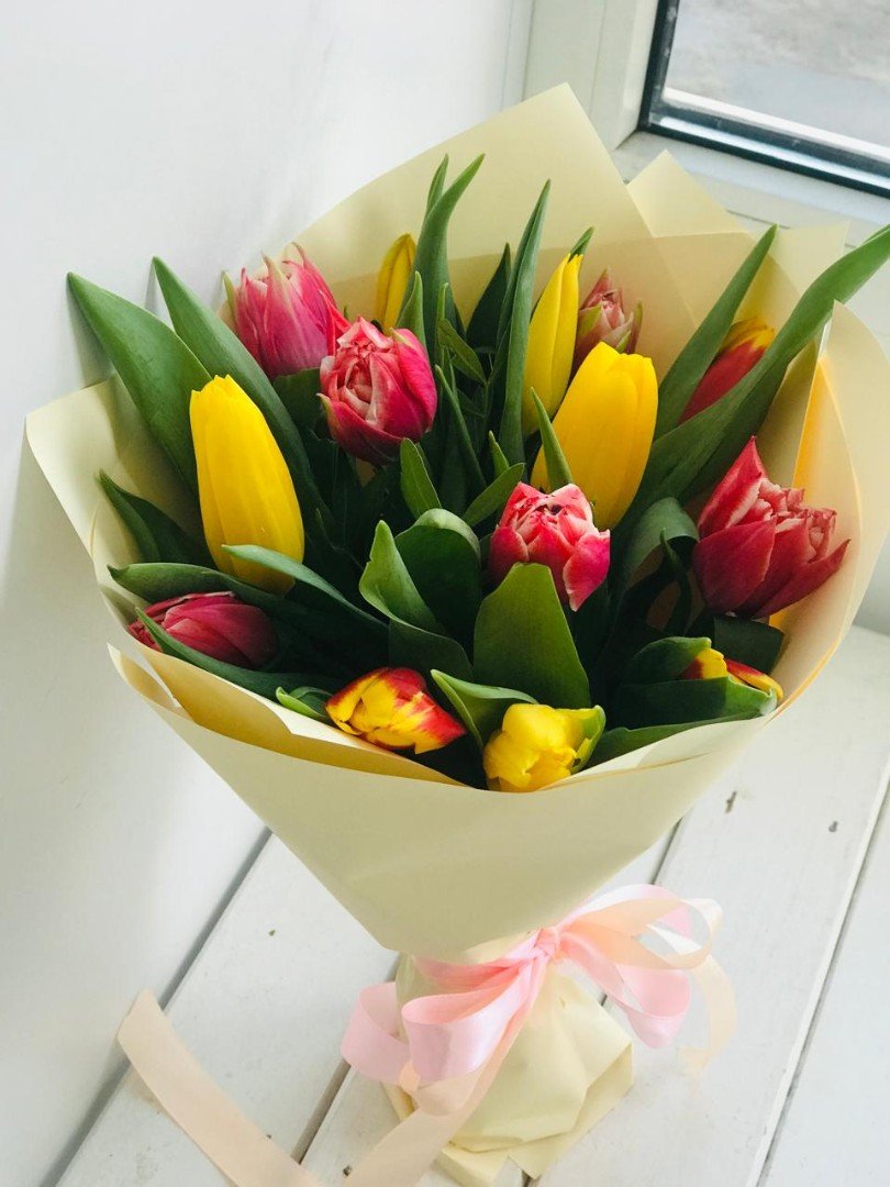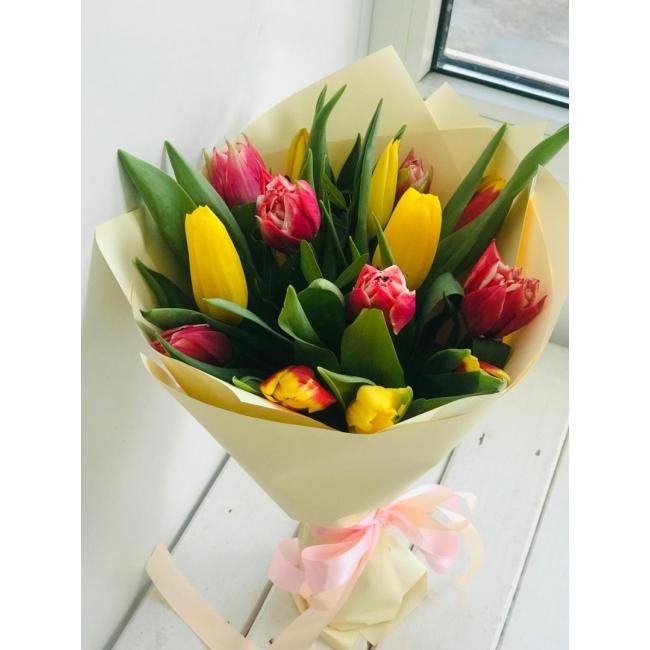 Описание Разноцветные тюльпаны собраны в классический букет. Желтый цвет, как лучики весеннего солнца, пробиваются среди зелени. Этот букет будет приятным сюрпризом в Праздничный день.