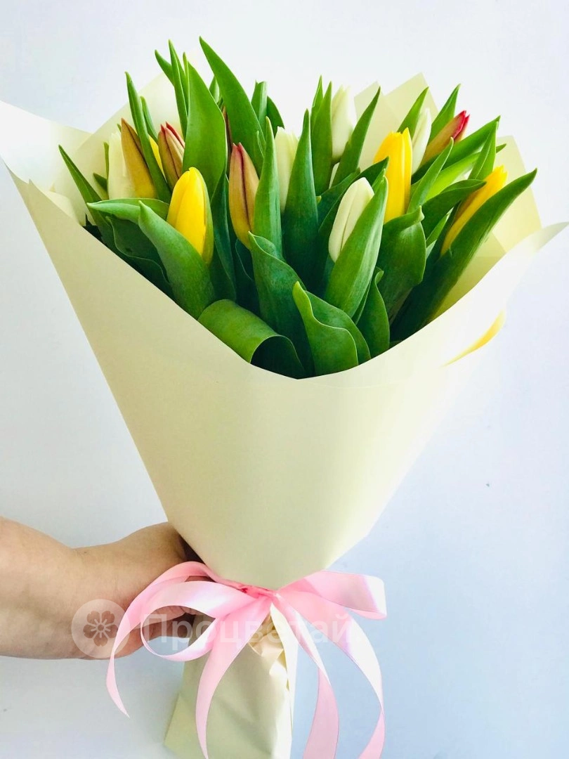 Классический букет из 15 разноцветных тюльпанов в упаковке. Порадует получательницу своими красками и ароматом весны.