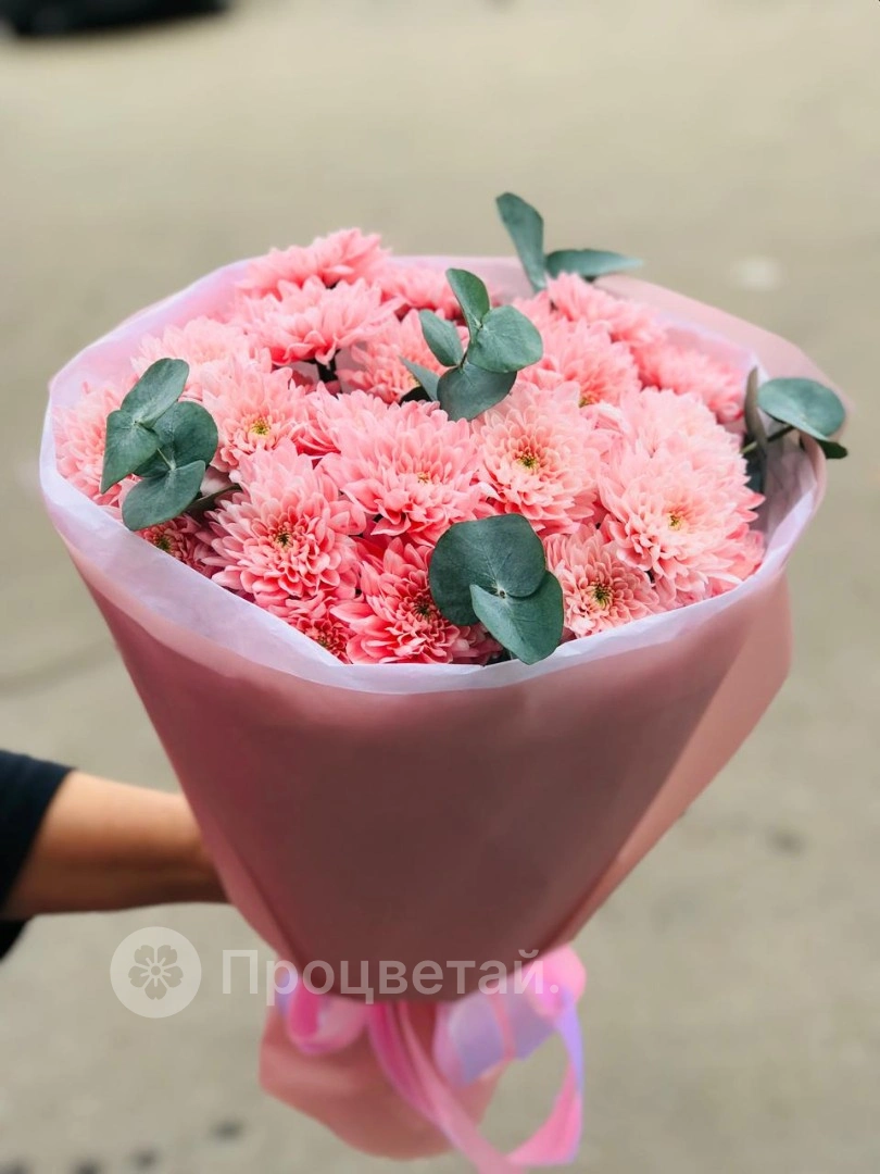 Элегантный букет сочетает в себе нежность и оригинальность. Букет собран из изысканных розовых кустовых хризантемы, чьи пышные и необычные соцветия придают букету особую атмосферу. Их аккуратные формы и яркий цвет создают ощущение свежести и романтики.